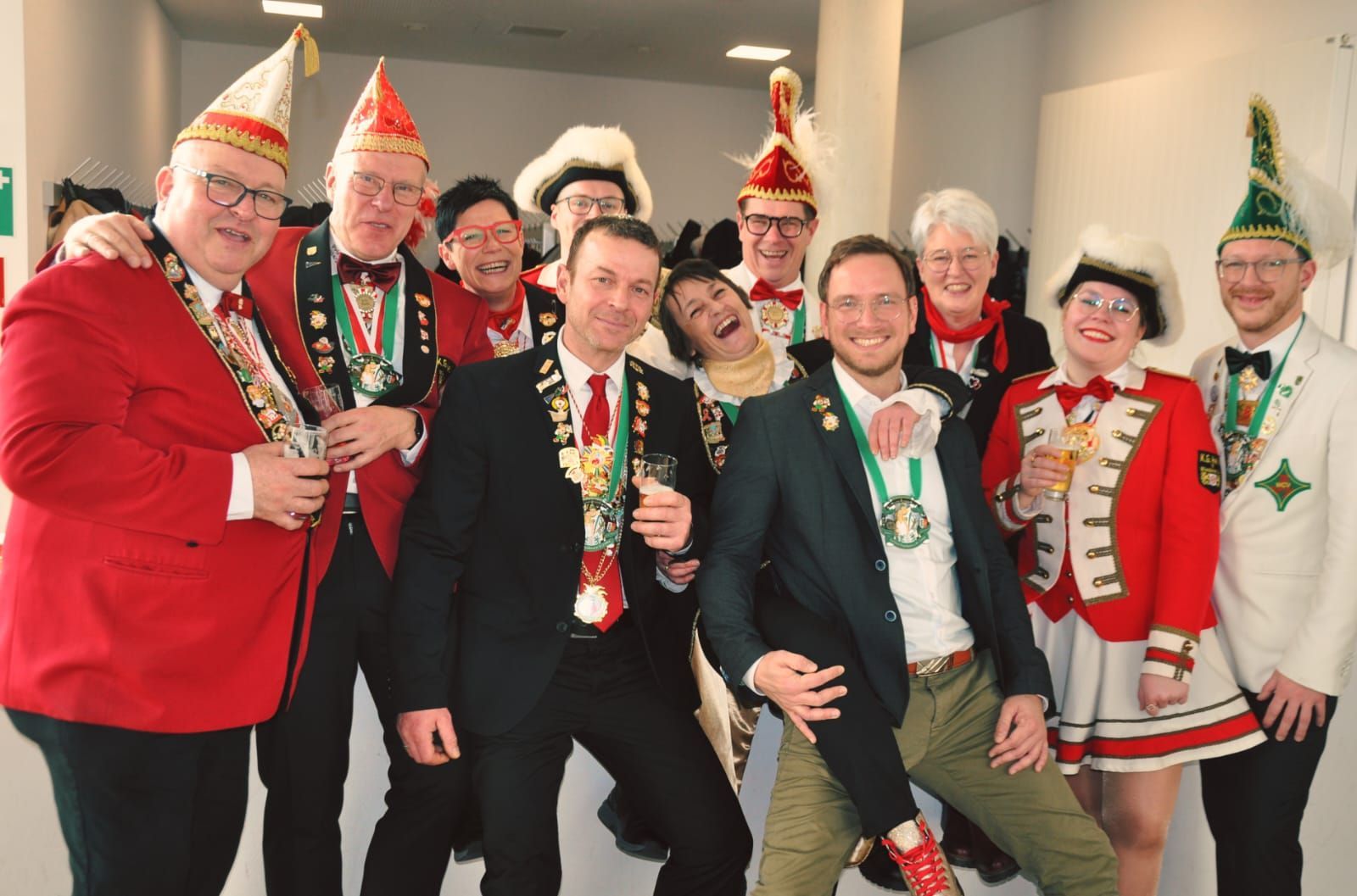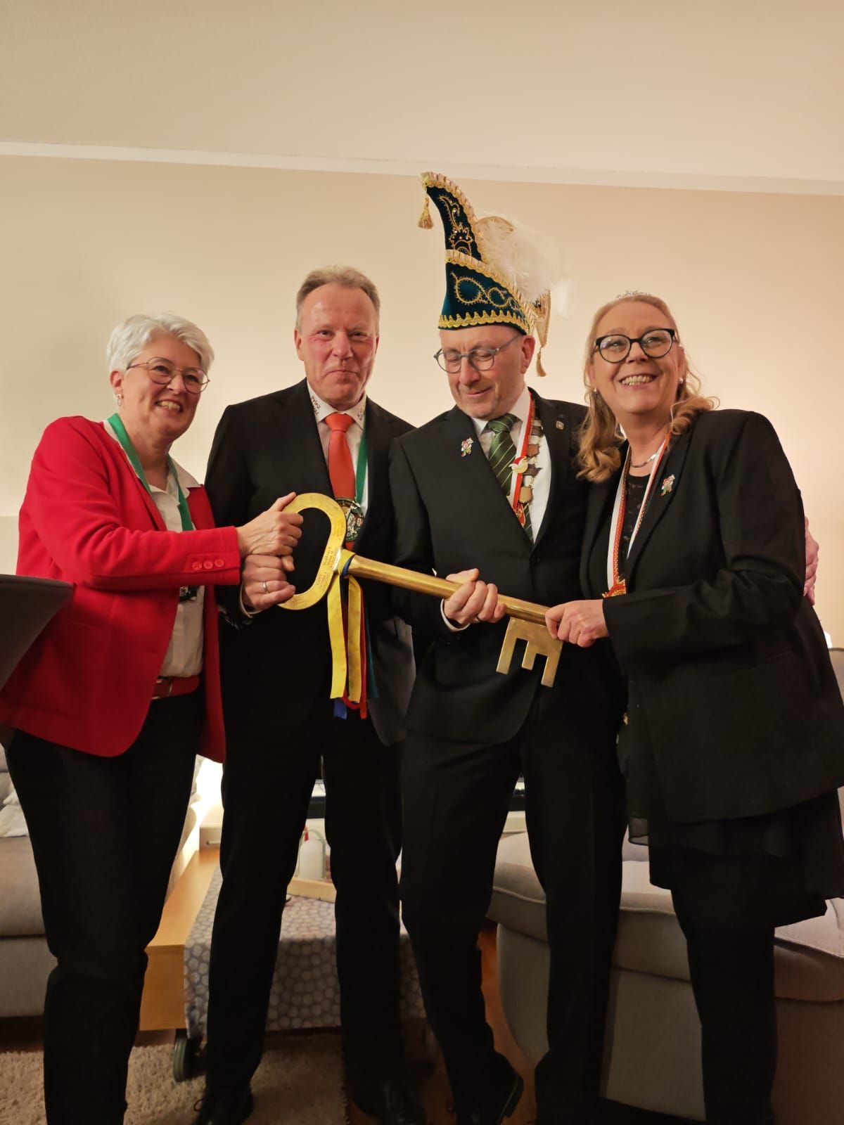Schlüsselrückgabe im Rathaus Mit einem spannenden endete die närrische Regentschaft: Der Schlüssel ist zurück beim Bürgermeister im Rathaus. Damit wurde die symbolische Machtübernahme der Karnevalisten offiziell beendet. Im Rahmen der Schlüsselrückgabe bot sich noch einmal die Gelegenheit, hinter die Kulissen zu schauen. Das Büro des Bürgermeisters wurde neugierig in Augenschein genommen – inklusive Probesitzen auf dem Bürgermeisterstuhl. Ein besonderes Highlight war der Aufstieg auf das Dach des Rathauses: Von dort oben bot sich ein beeindruckender Ausblick über Rheda-Wiedenbrück. In einer Vitrine wurden zur Erinnerung Fotos und Orden aufgehängt, die an die närrischen Tage und die ereignisreiche Amtszeit erinnern. Mit einem Augenzwinkern und vielen schönen Momenten im Gepäck wurde die Schlüsselmacht nun wieder offiziell abgegeben. Ein gelungener Abschluss einer fröhlichen und unvergesslichen Session.