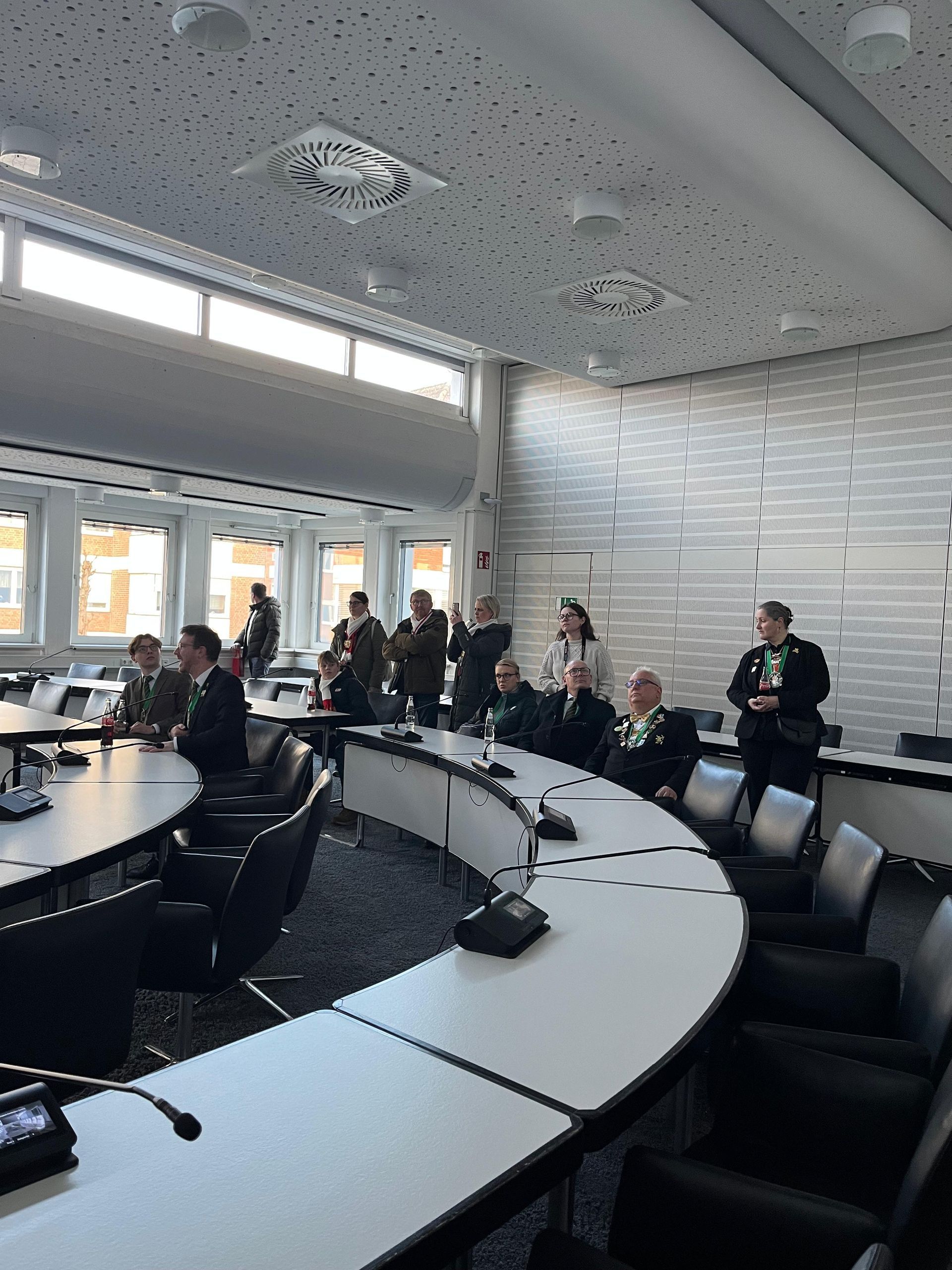 Im Rahmen der Schlüsselrückgabe bot sich noch einmal die Gelegenheit, hinter die Kulissen zu schauen. Das Büro des Bürgermeisters wurde neugierig in Augenschein genommen – inklusive Probesitzen auf dem Bürgermeisterstuhl. Ein besonderes Highlight war der Aufstieg auf das Dach des Rathauses: Von dort oben bot sich ein beeindruckender Ausblick über Rheda-Wiedenbrück.
